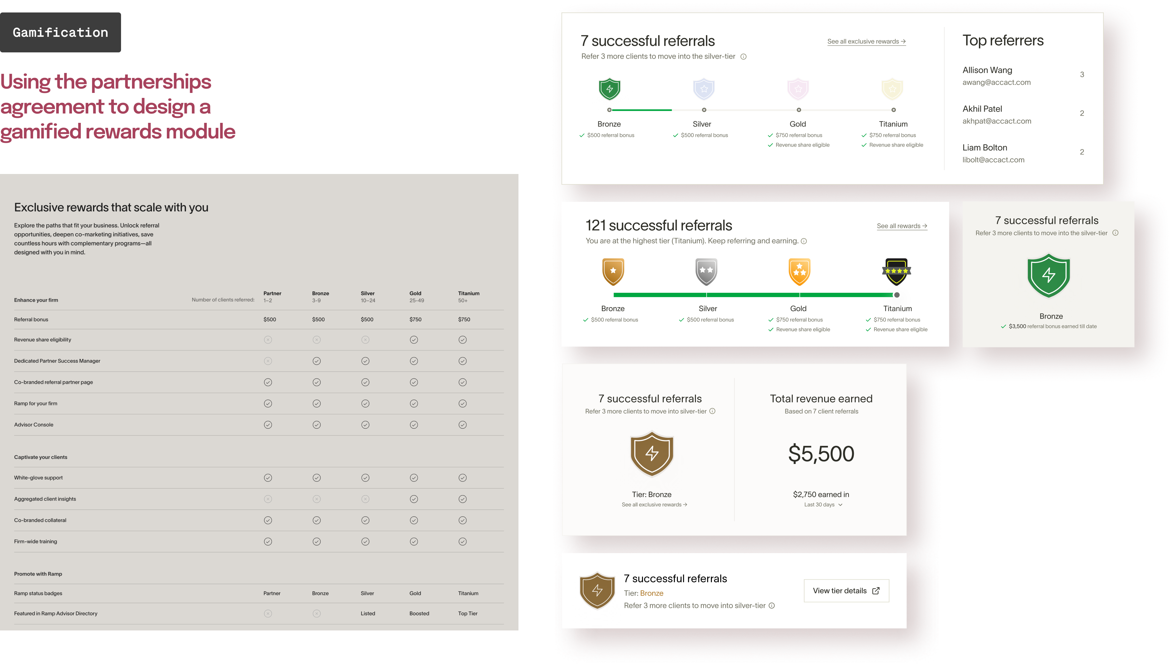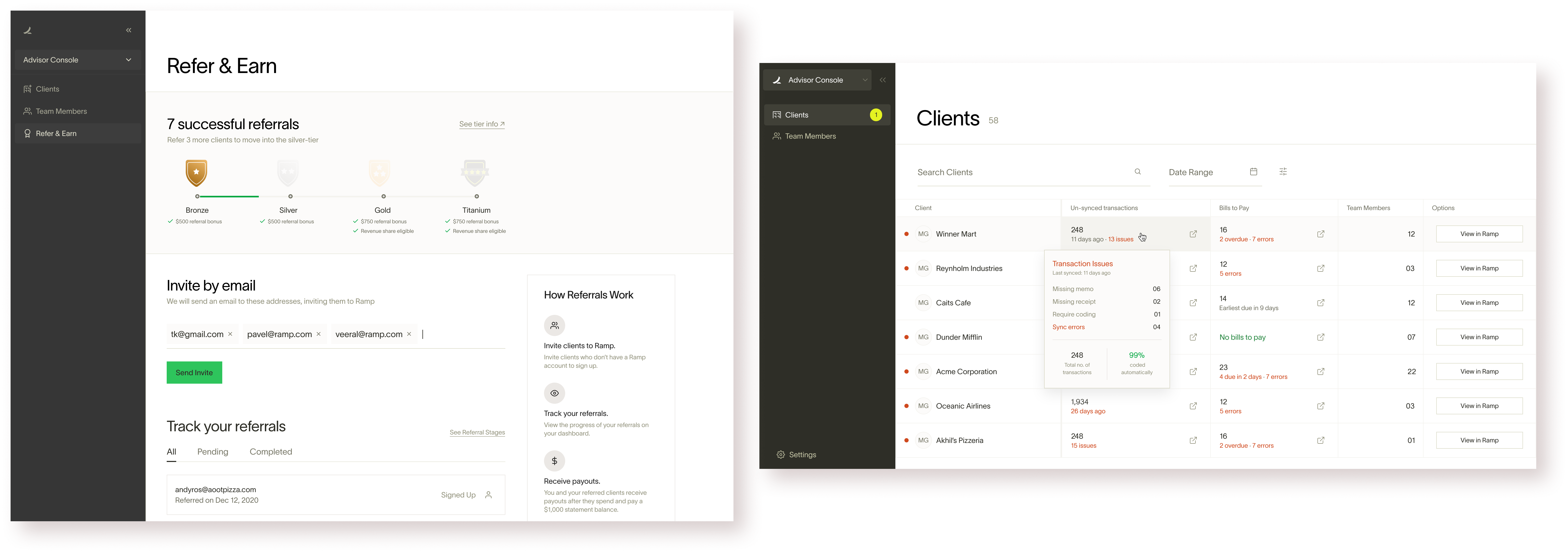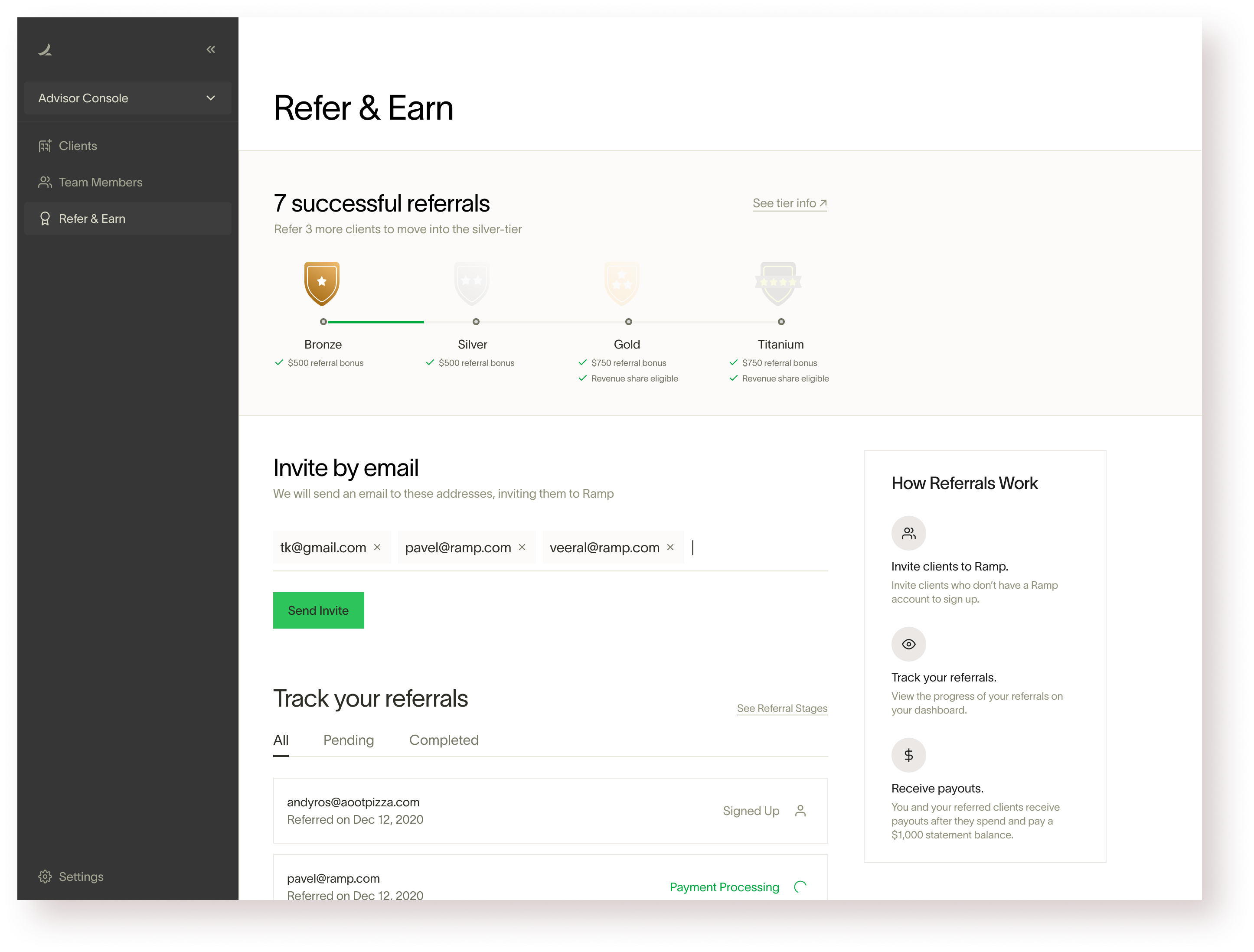 What were we trying to solve for: Ramp has a robust accounting partnership referral program for accountants that outlines different incentive tiers (silver, gold, etc.) but we did not have any control over the channels through which the referrals were happening. There was no formal avenue for the accountants to refer external clients. We wanted to change that by bringing native referral capability within the Advisor Console.