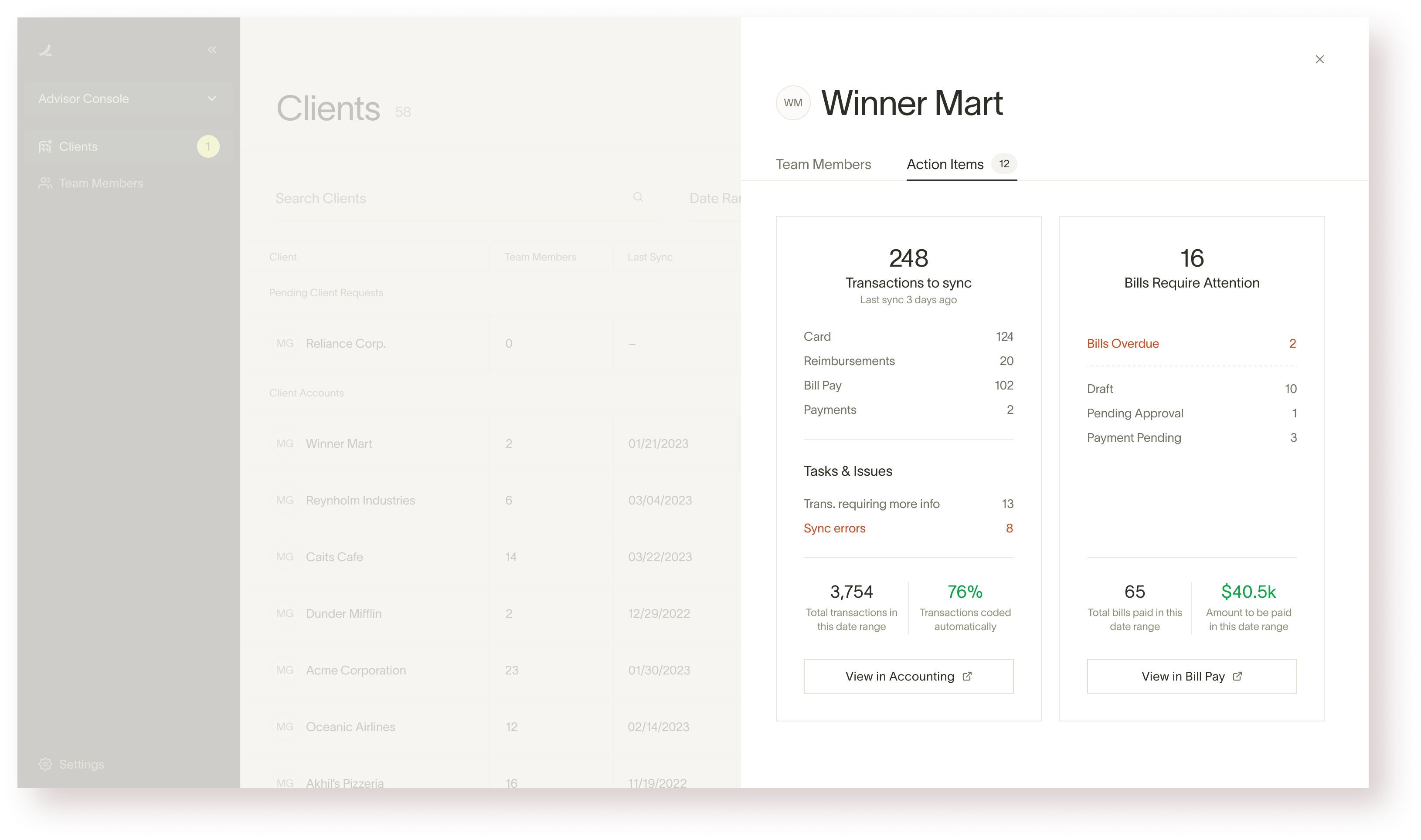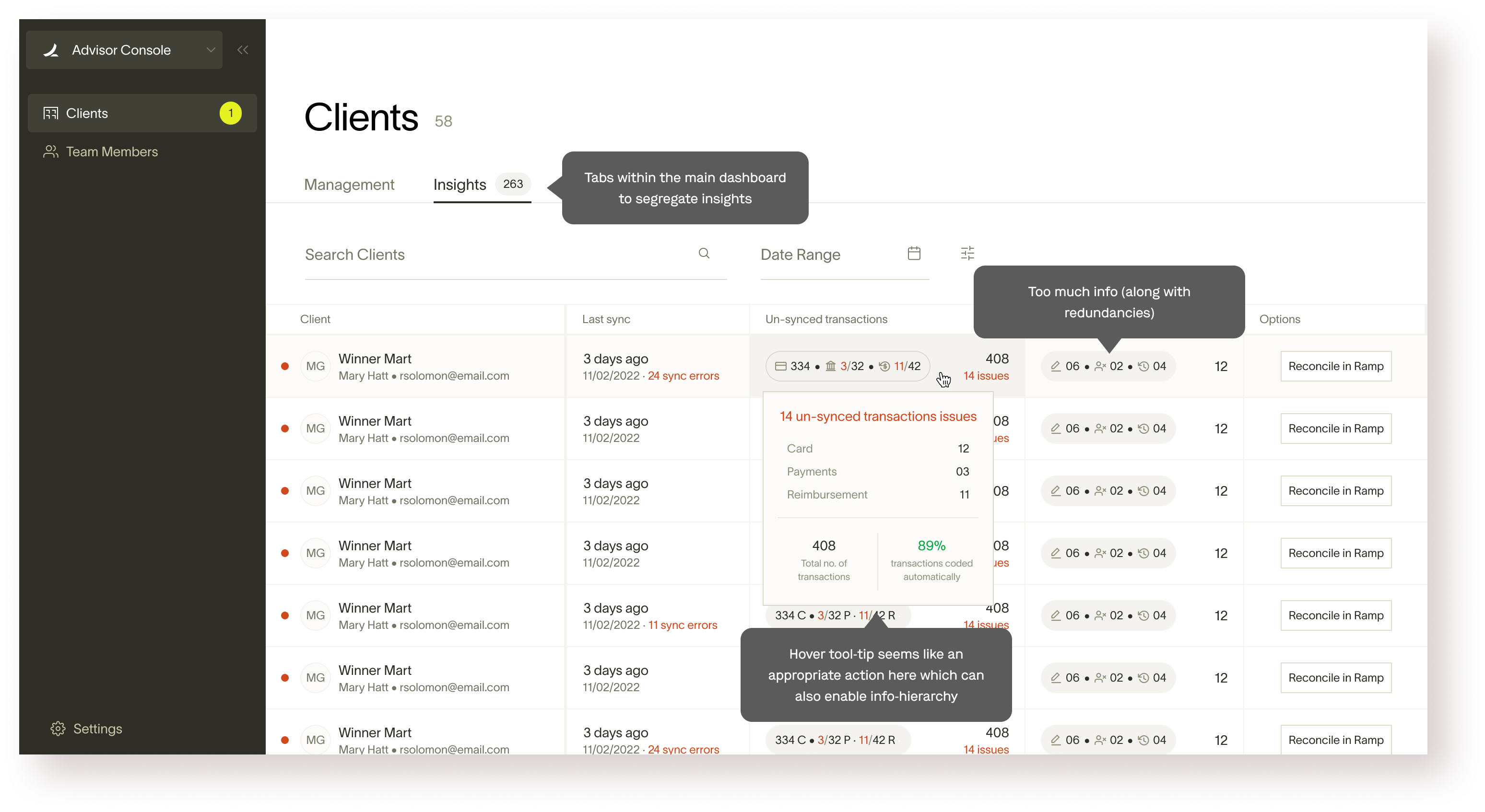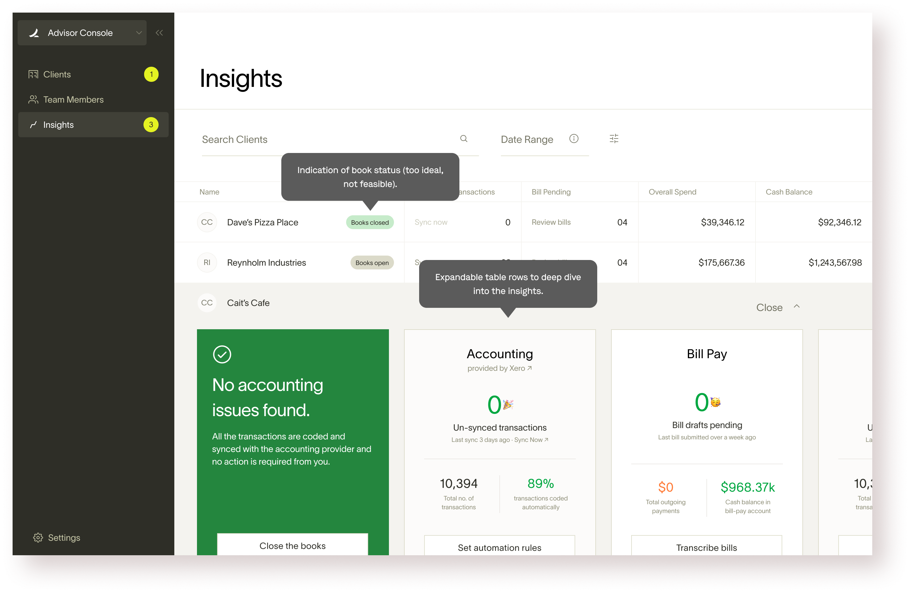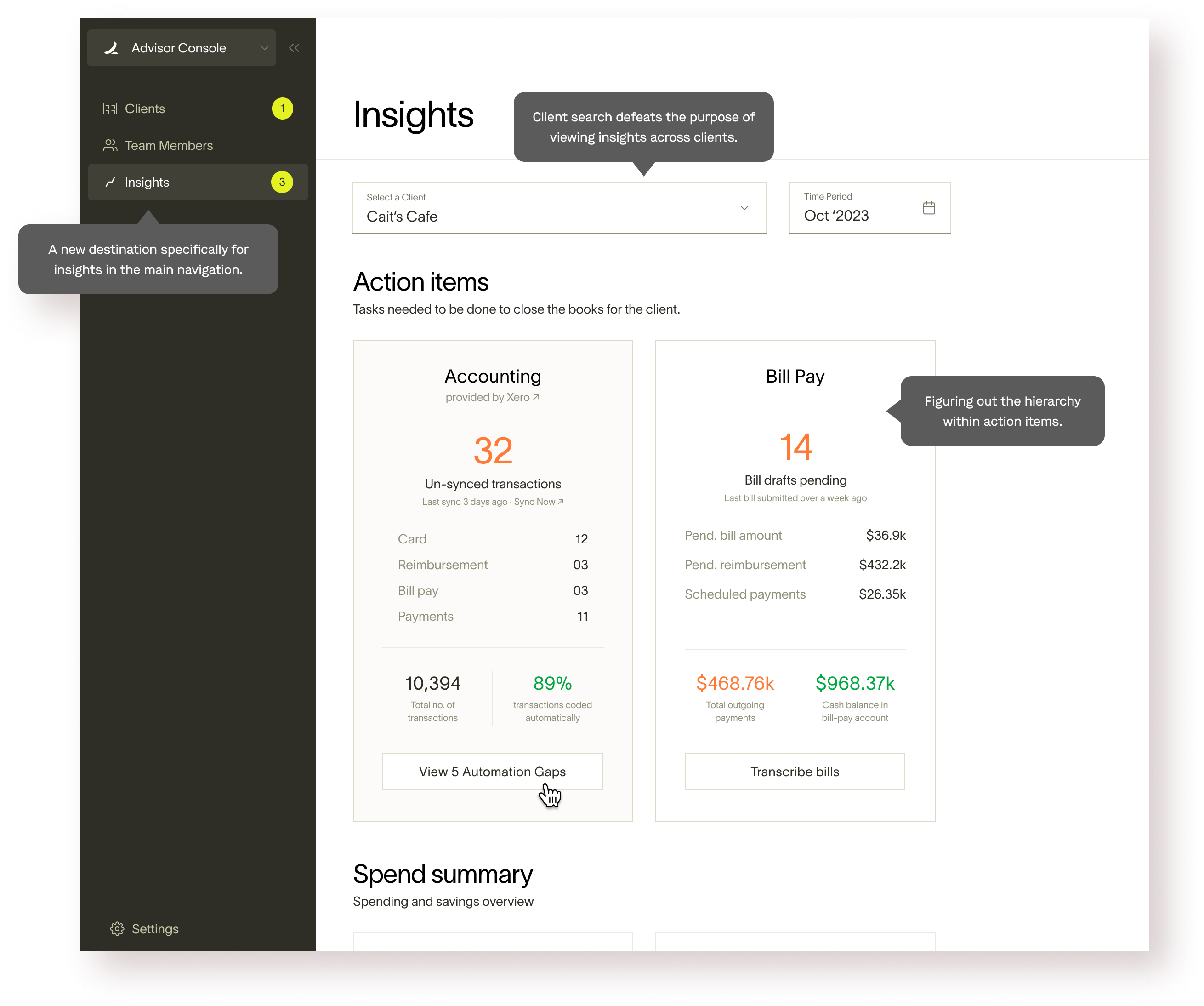 Primary goal: Give advisor console users the ability to centralize insights across clients without having to click into each client account. We believe that these insights will be primarily leveraged to improve internal processes for accountants, rather than being directly client facing.