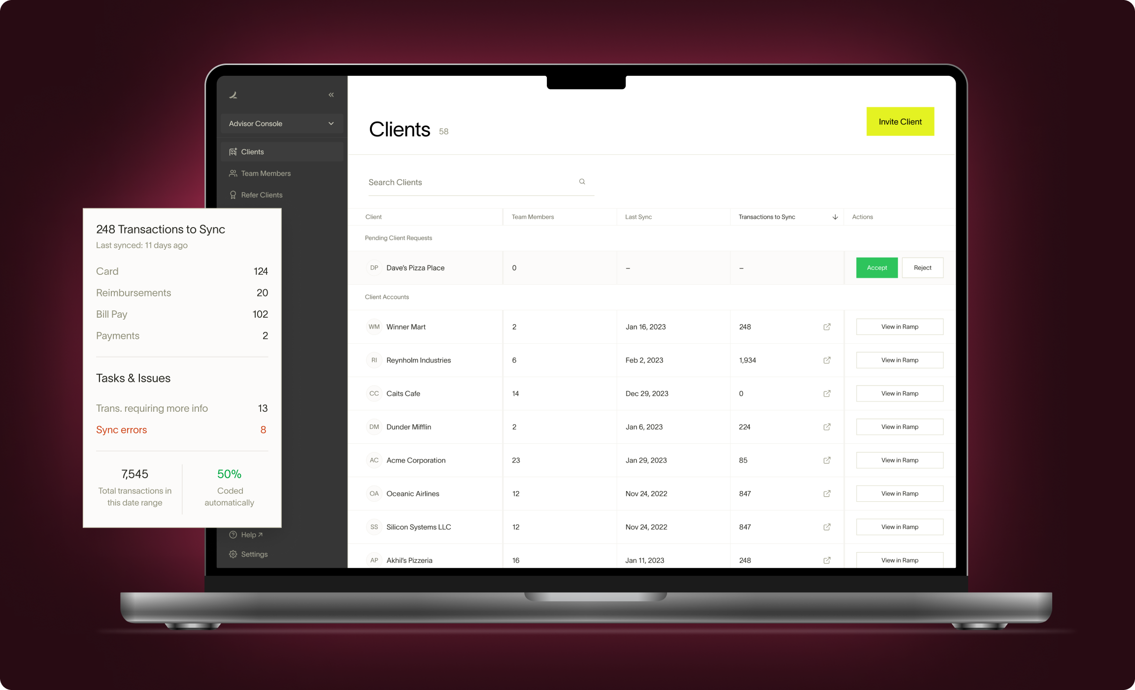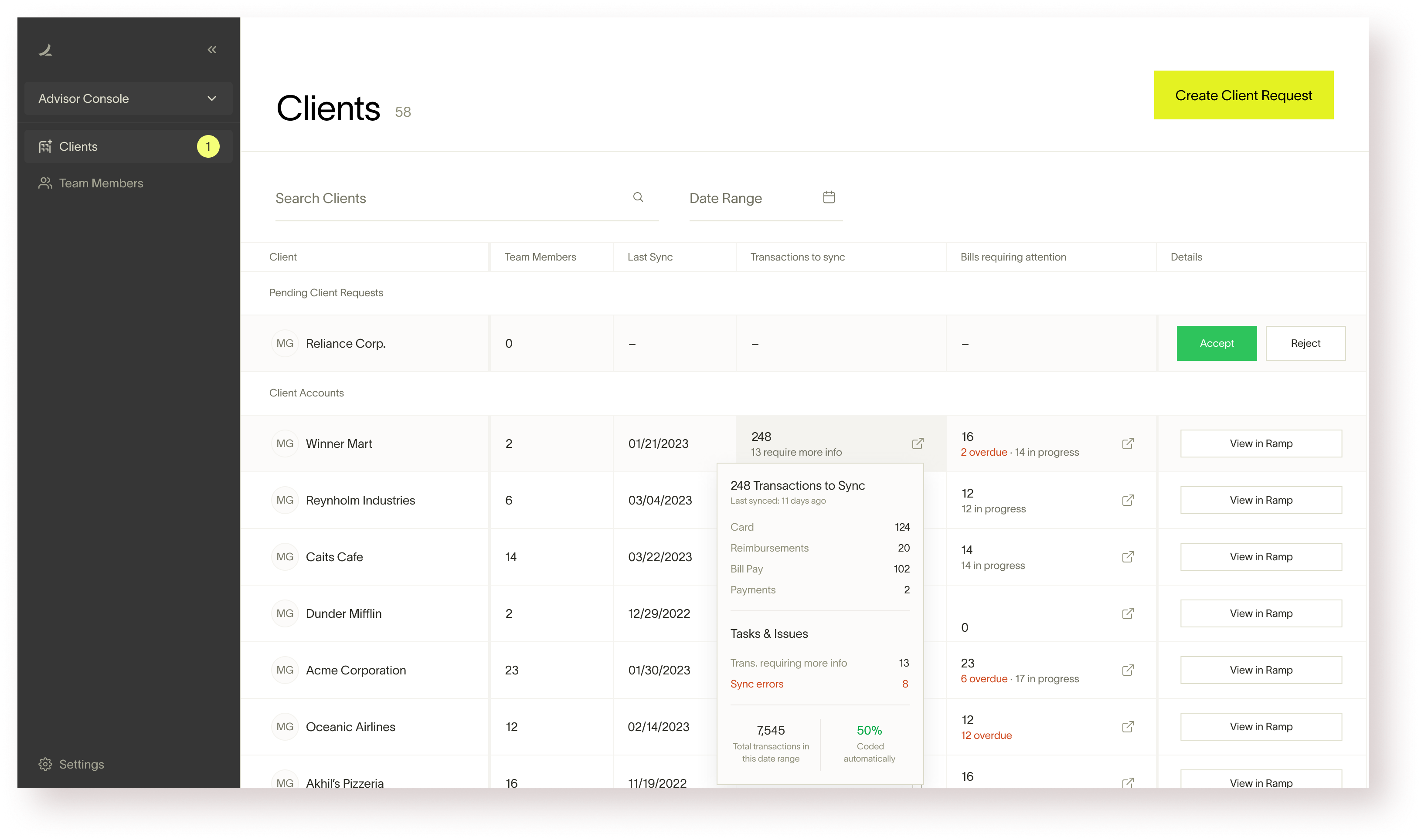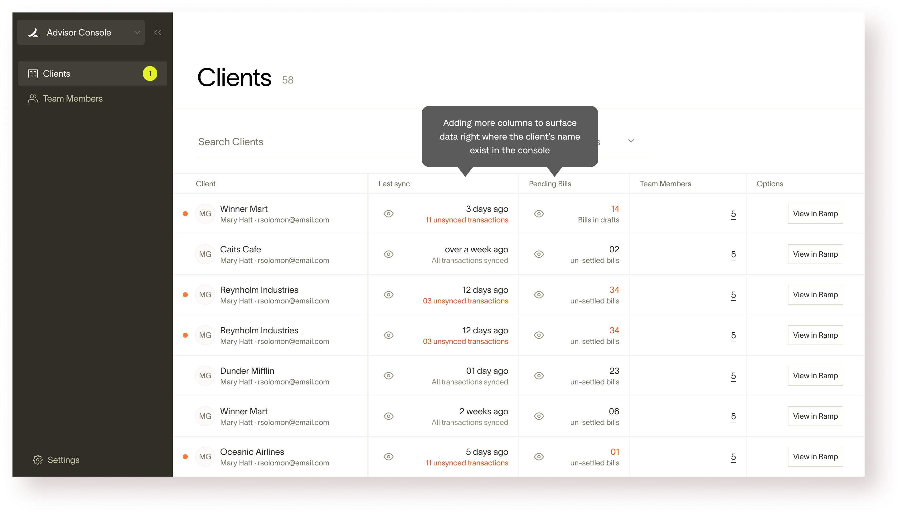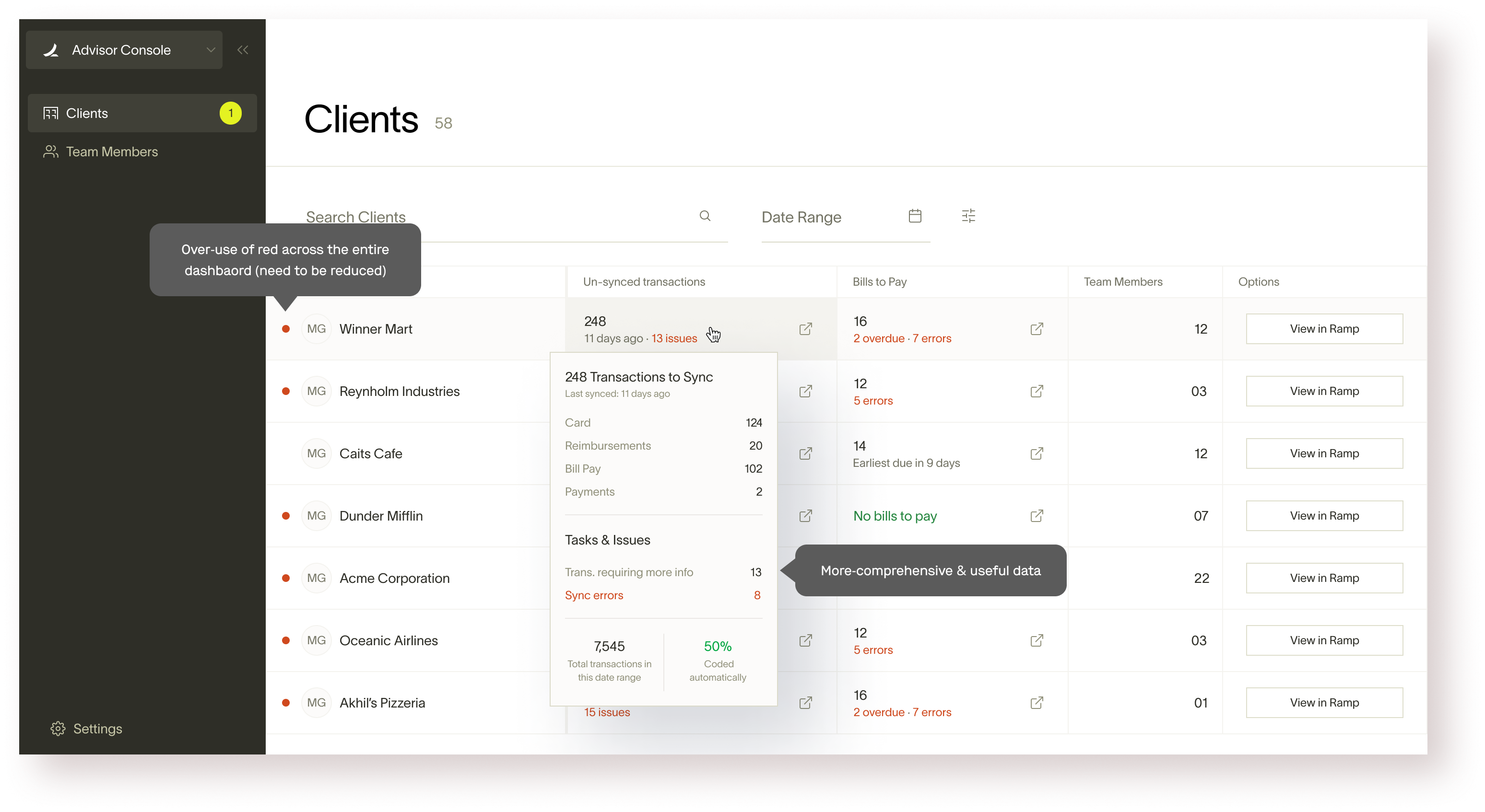 The Growth team at Ramp wanted to leverage that opportunity and hence the idea of Ramp Advisor Console was born. Ramp had strong accounting partnership program and we wanted to leverage that partnership to launch a product that makes the accountant’s lives easier. This will, in-turn, motivate the accountant partners to bring other clients (not on Ramp) to the Ramp ecosystem.