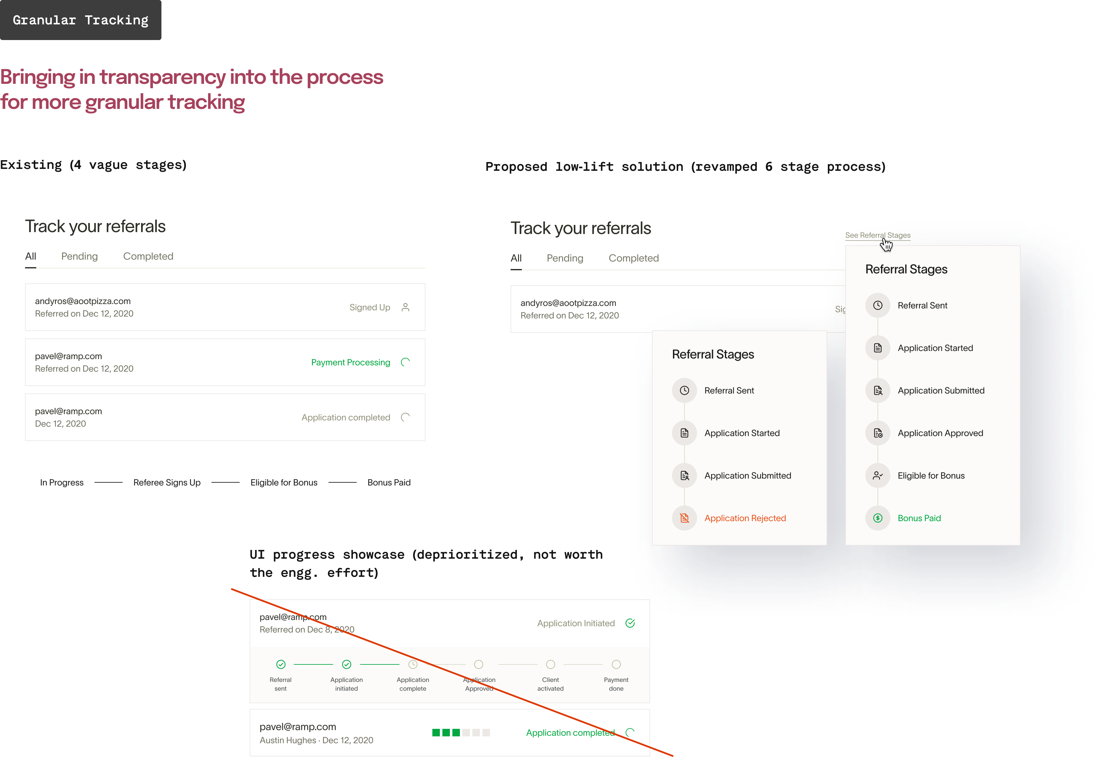 The explorations were a mix of existing Ryu (Ramp design system) elements and new ones. The idea was to figure out the best and the most efficient layout before taking the final ones to the users for review.