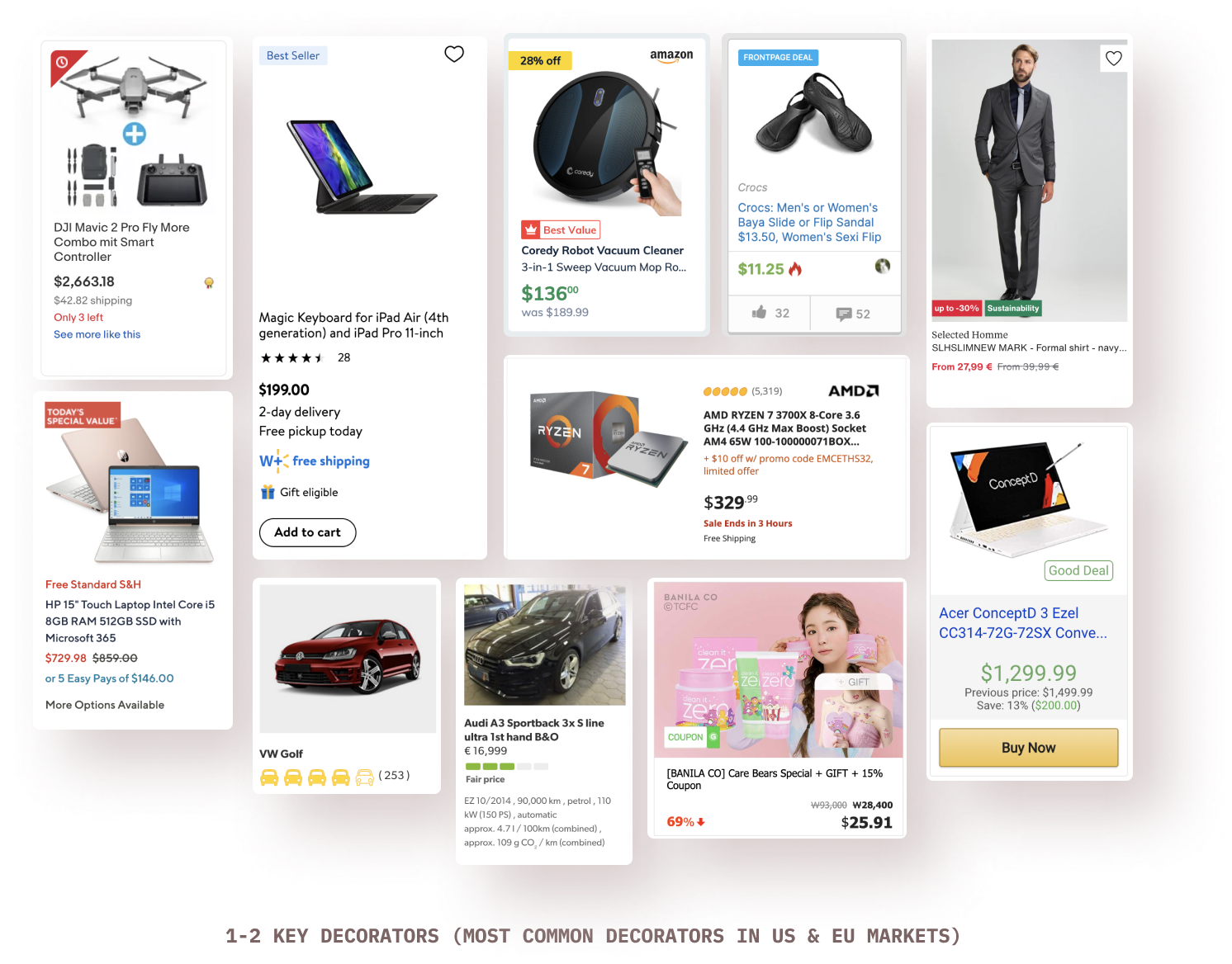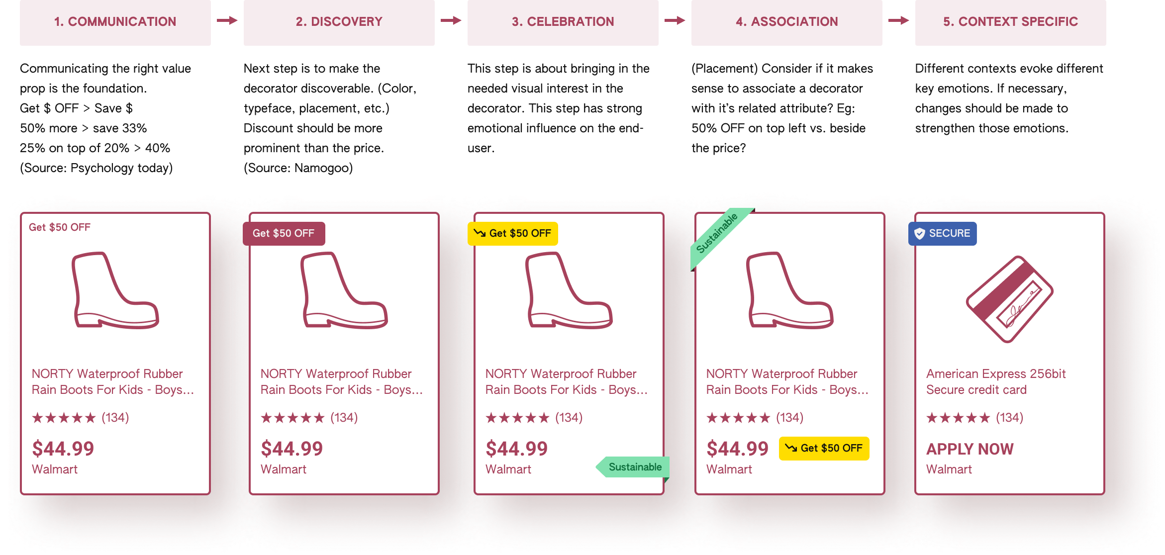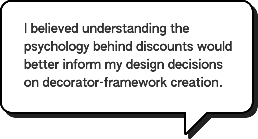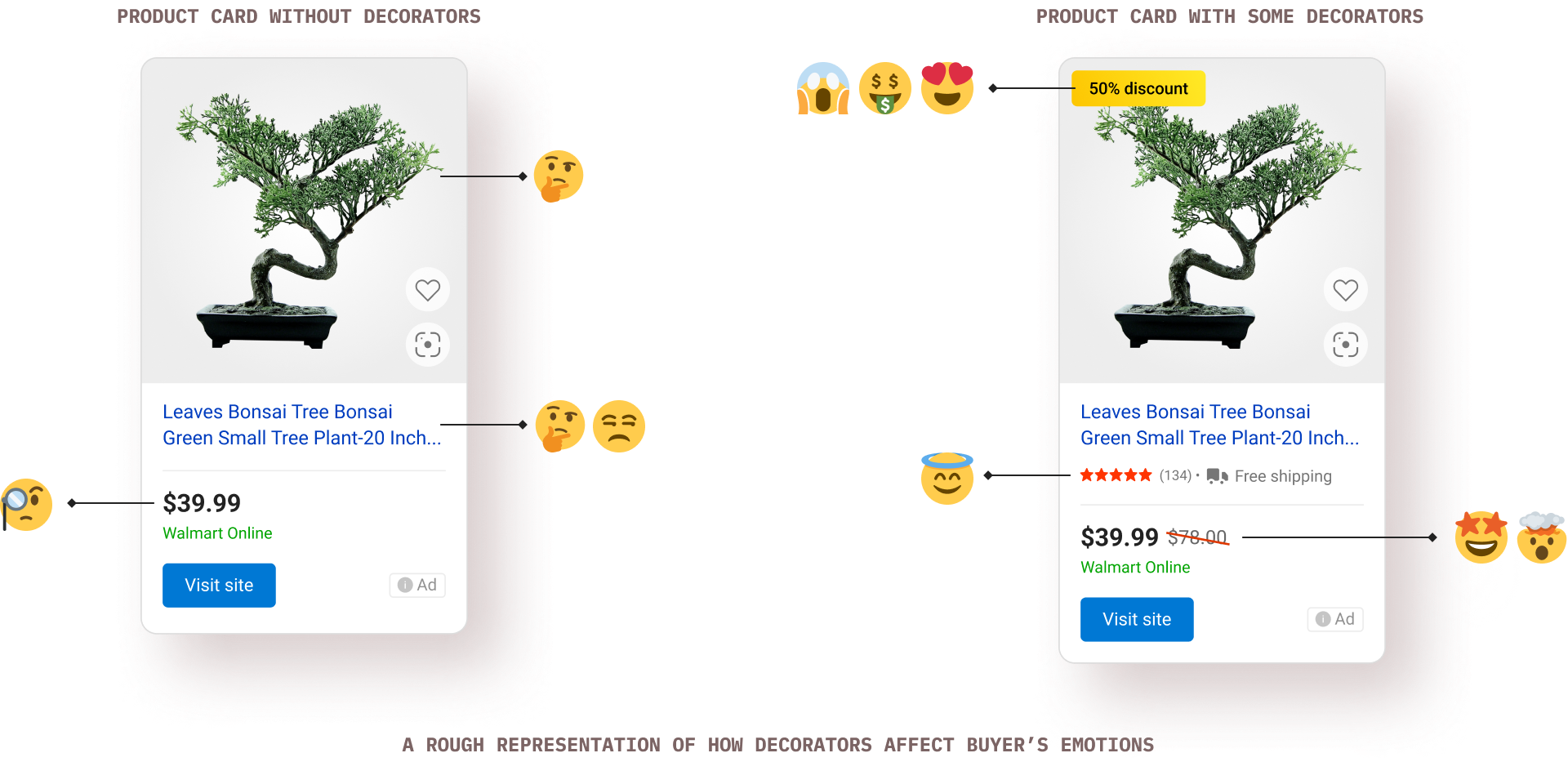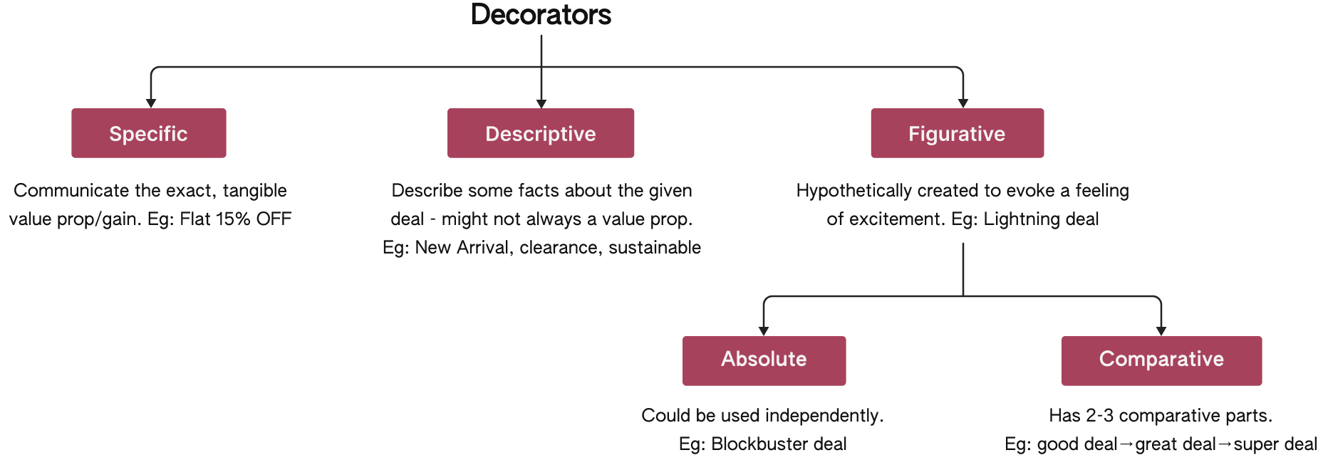 In e-commerce, the seemingly small decorators play a vital role in influencing consumer behavior and conversion. Decorators are THE way for brands and platforms to communicate the value of a discount or product to the users. Hence, most of the psychological aspects related to deals and discounts can be leveraged to design better decorators for shopping experiences.