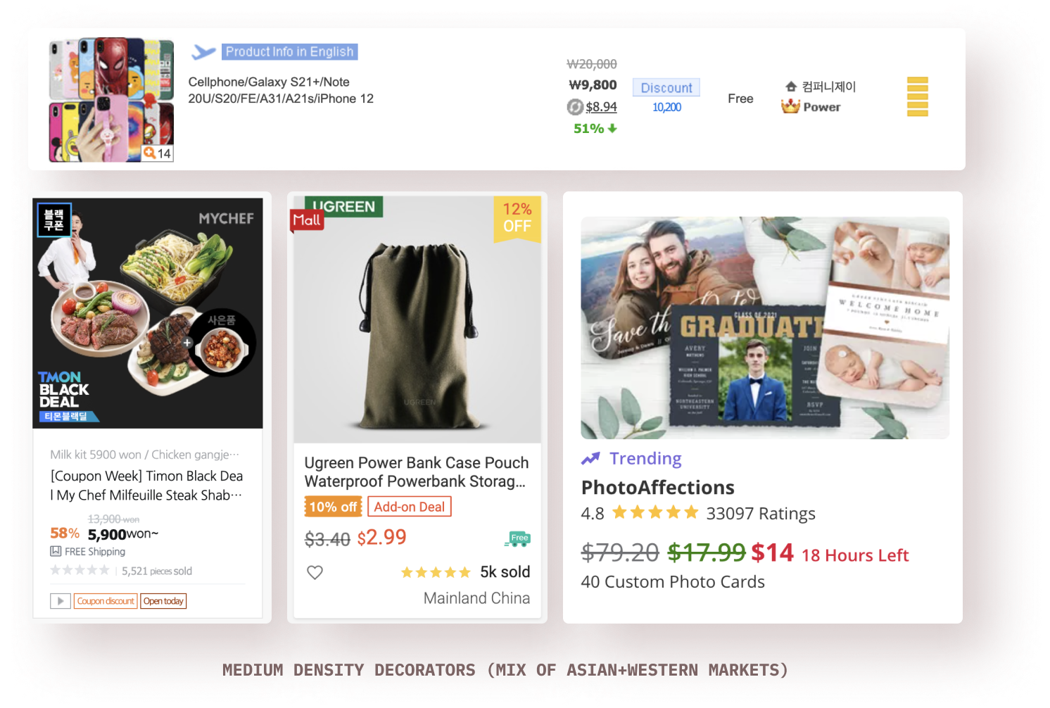Usual run of the mill product cards (mostly seen in US/EU based markets) with clear focus on 1-2 decorators.