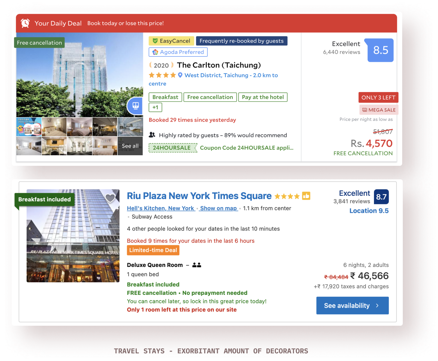 The travel segment (especially hotels & stays) takes the cake for the most no. of decorators in any segment (as far as I know), sometimes even reaching 12-15 or more in a single product card.