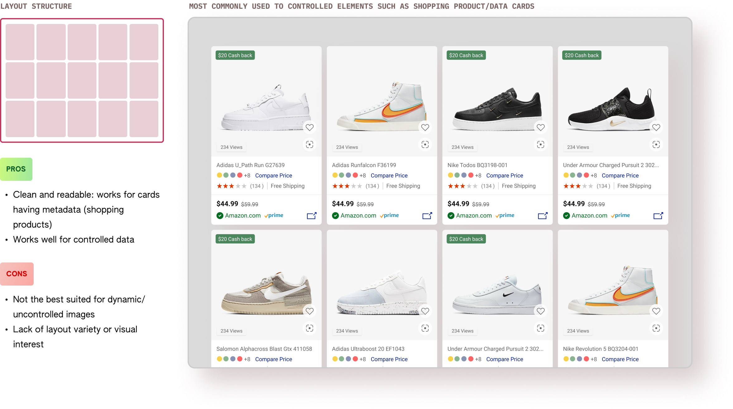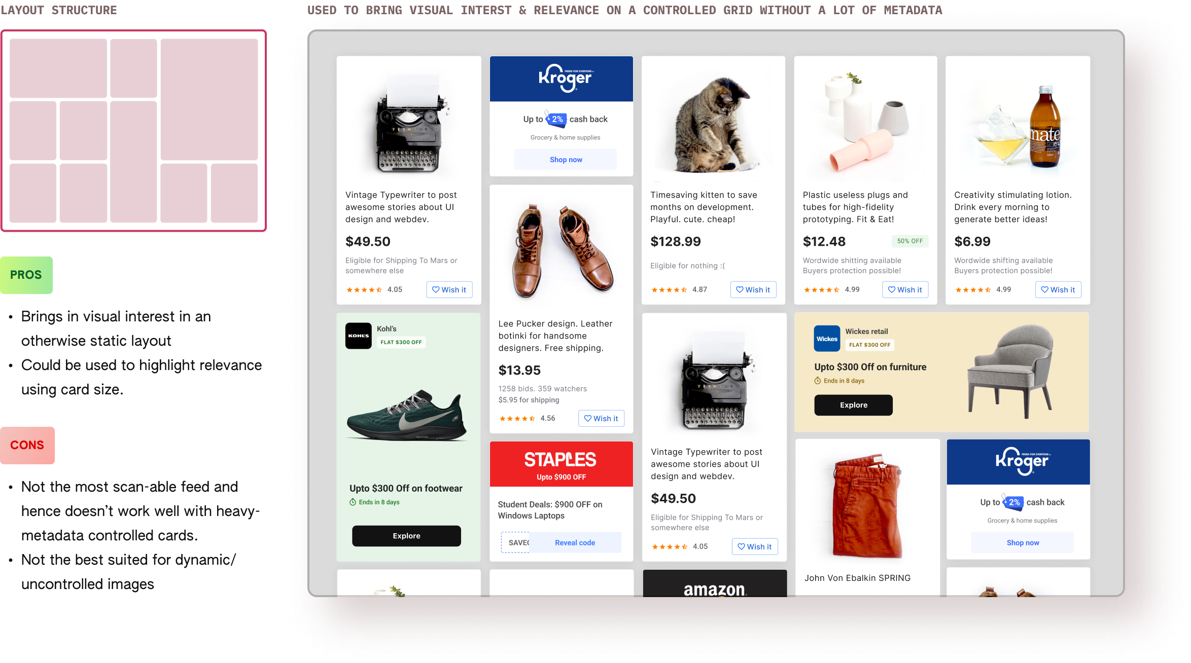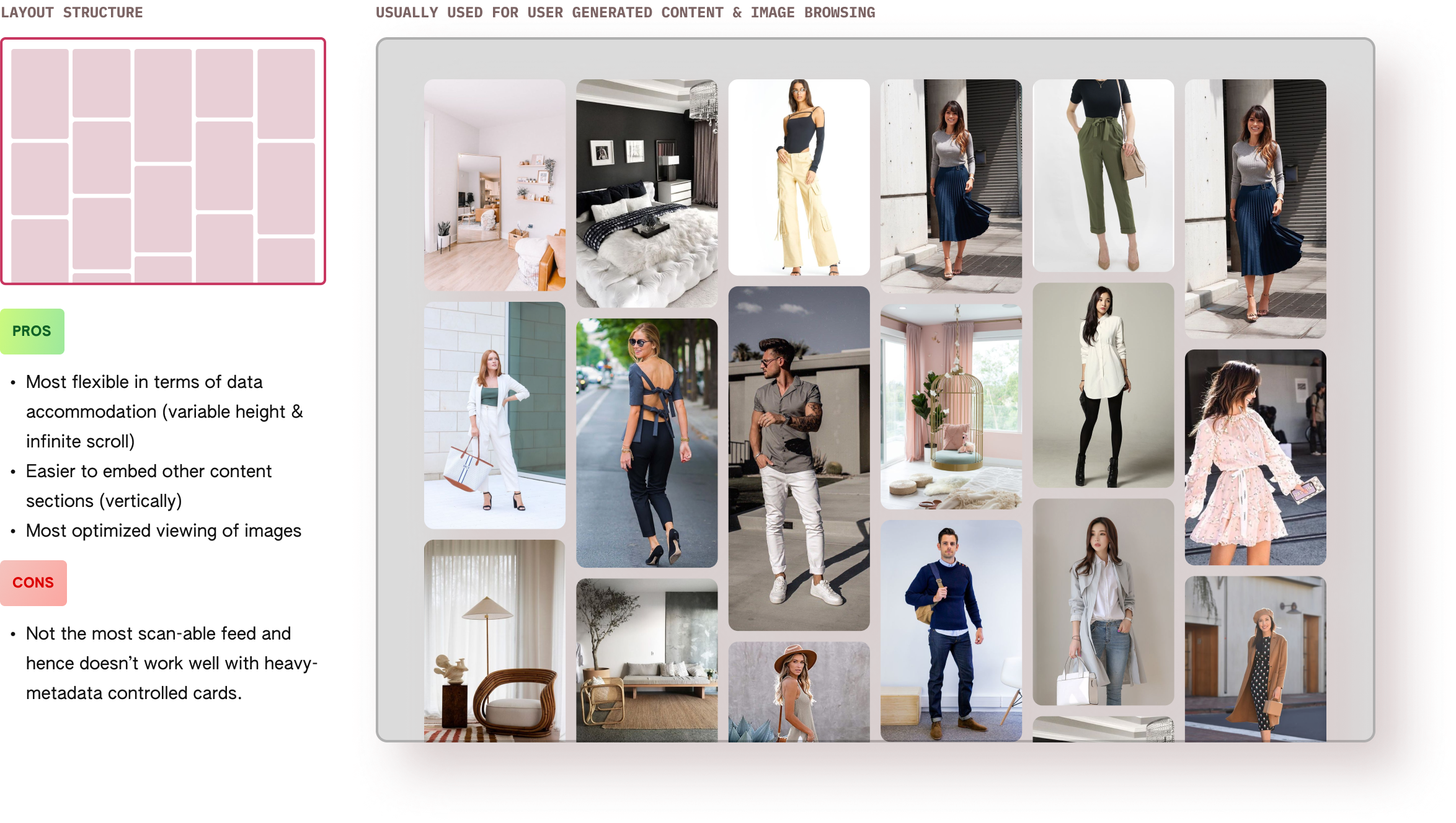 Before I started working on the visual feed, there were some pre-existing design explorations already done by another designer some time back. The explorations were mostly done for the feed itself and, as evident from the concept map above, the layout/feed is (of course) the central element of the experience. Hence, I dived deep into studying the layout structure (shown below).