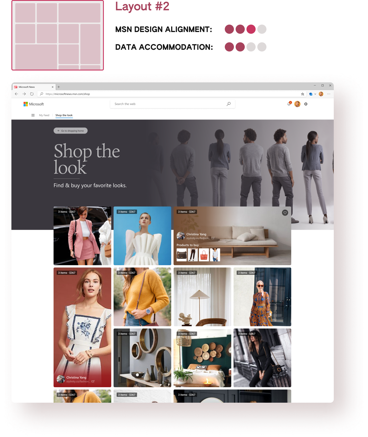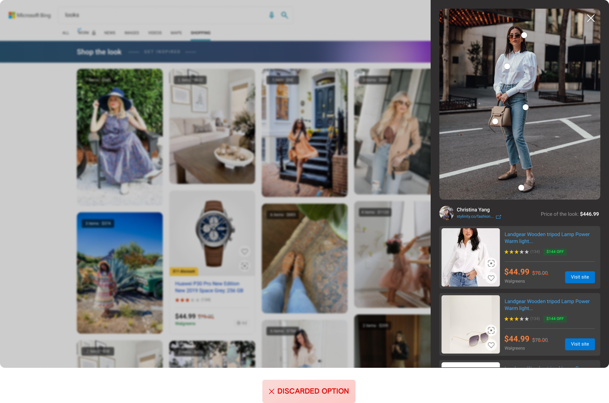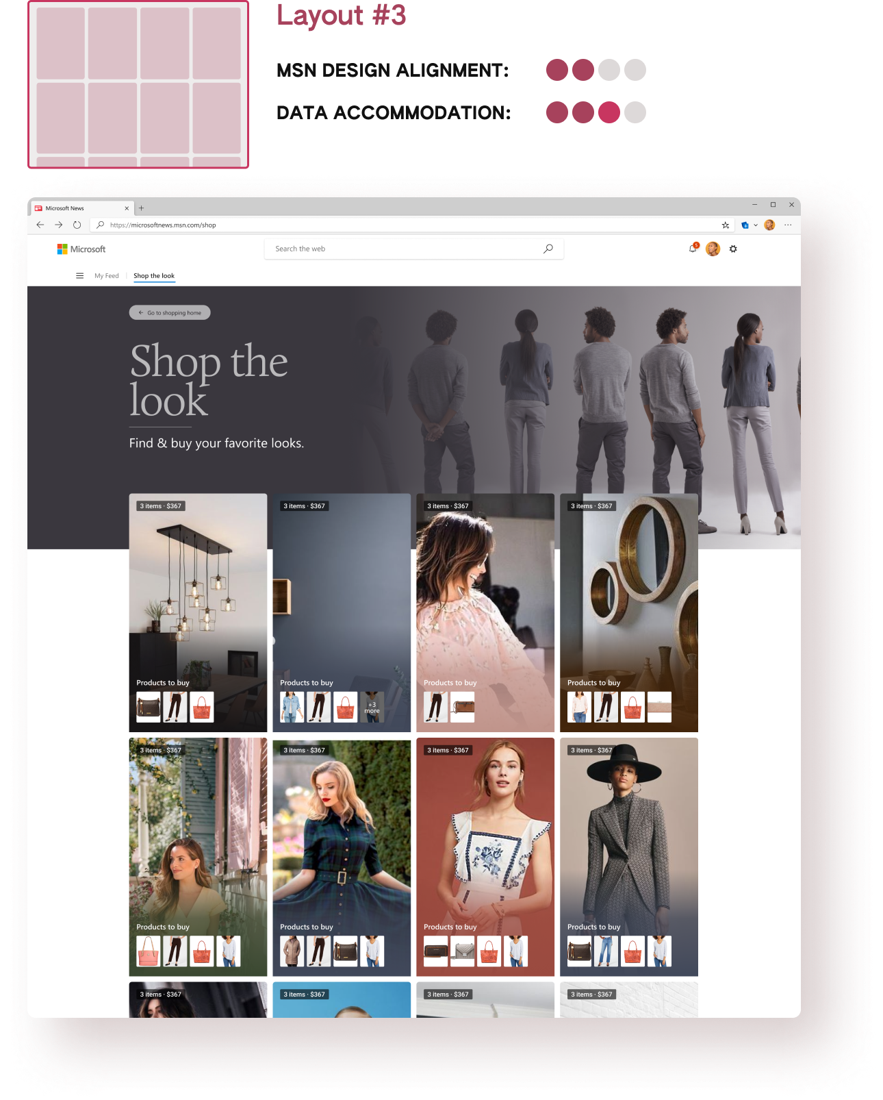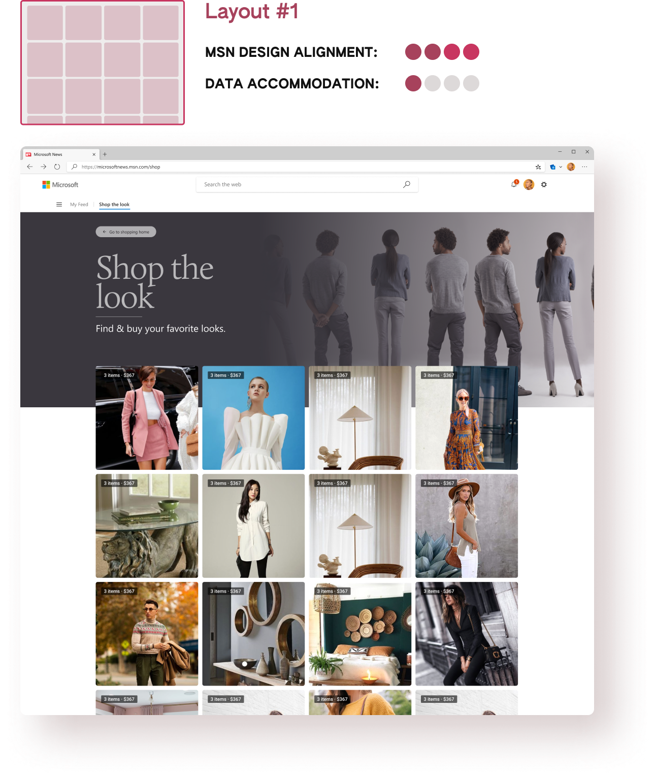 While the Shop the Look feed work was ongoing, there was a change in business direction for the product- the feed will be hosted on MSN first (with super-short turnaround time) and will be brought to Bing later on. This changed a lot of things and I tried to re-purpose the designs for MSN.